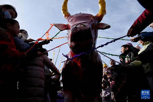 2月4日,人們在甘肅省敦煌市白馬塔景區(qū)“打春?!薄#ㄐ氯A社發(fā) 張曉亮 攝)