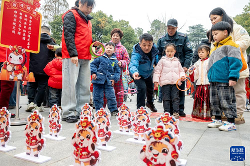 2月4日,在浙江省湖州市長興縣雉城街道古城公園,社區(qū)居民參與“馬年套圈圈福氣”趣味體驗(yàn)活動。(新華社發(fā) 譚云俸 攝)