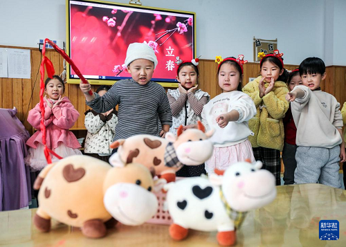 2月4日,在河南省焦作市博愛縣縣直幼兒園,小朋友做“打春?!庇螒?。(新華社發(fā) 程全 攝)