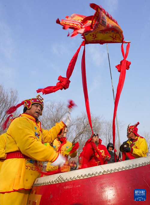 2月5日,在山東省鄒平市臺子鎮(zhèn),黃河大鼓表演隊(duì)在文藝廣場為村民表演。(新華社發(fā) 董乃德 攝)