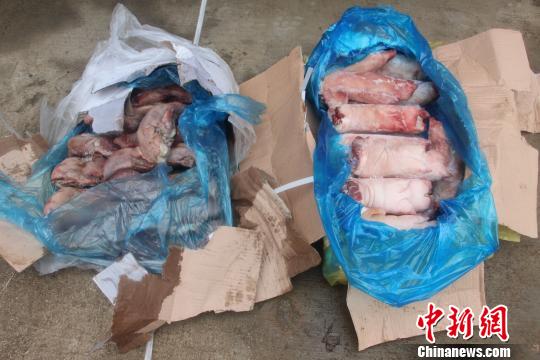1月25日8時(shí)許,支隊(duì)瀾滄邊境檢查站執(zhí)勤官兵查獲3輛可疑貨車,當(dāng)場(chǎng)從車廂內(nèi)查獲用麻布袋遮蓋的冰凍雞腳、豬腳等走私凍品105噸。1月27日19時(shí)30分,普洱邊防支隊(duì)支隊(duì)黃莊查緝點(diǎn)在323國道某段開展公開查緝,查獲2輛由景洪駛往昆明的貨車,發(fā)現(xiàn)車內(nèi)拉載的冰凍鴨掌等凍品外包裝均是英文標(biāo)識(shí),且沒有任何檢驗(yàn)檢疫及運(yùn)輸銷售等合法手續(xù)憑證,經(jīng)稱重共計(jì)9噸。如果沒有被邊防官兵查獲,那這些從境外走私入境的劣質(zhì)過期冰凍肉質(zhì)品,將在春節(jié)期間流入至少2萬戶家庭的餐桌。