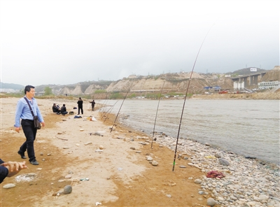 當(dāng)日下午3時(shí)許,蘭州晨報(bào)記者在雁白大橋西側(cè)的黃河岸邊看到12把魚(yú)竿一字排開(kāi),3名釣魚(yú)者坐在旁邊沙灘上正在等待魚(yú)兒上鉤,還有兩名中年男子正在周?chē)鼍W(wǎng)。在相隔十多米處,記者發(fā)現(xiàn)還有兩名男子分別撐著魚(yú)竿釣魚(yú),有一名捕魚(yú)者在撒網(wǎng)?!斑@是雙面粘漁網(wǎng),河內(nèi)稍大一些的魚(yú)兒只要撞進(jìn)網(wǎng)里就擺脫不了?!币幻遏~(yú)男子得意地說(shuō)。