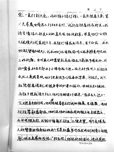 劉吉強(qiáng)還撰寫(xiě)了一封控告信??馗嫘爬?,他描述了7天夢(mèng)魘般的經(jīng)歷:辦案人員用腳踢他的臉,用手銬把他吊掛在鐵管做的橫梁上拳打腳踢,用電棍擊打身體的各部位。