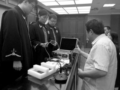 法官當(dāng)庭檢查齊某提供的理療儀,發(fā)現(xiàn)是三無產(chǎn)品。京華時報記者鄭羽佳攝