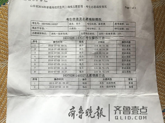 記者注意到,常升在7月5日上午9點51分登陸自己的賬號填報好了志愿之后便離開,但是當(dāng)天下午4點多,常升的賬號再次在同一臺電腦上登陸,而接下來賬號又在另外一個IP地址上連續(xù)登陸兩次,并且用完了兩次修改志愿的機(jī)會。“我就登陸過一次,在遲老師的電腦上?!背If,后面的三次操作他都不知道是誰所為。根據(jù)IP地址提供的線索,無論是誰修改了常升的志愿,都在遲老師的電腦上進(jìn)行過操作,然后又用另一臺電腦將常升的改志愿次數(shù)用完。常升的準(zhǔn)考證和密碼一直在自己手里保管,唯一有機(jī)會修改他志愿的就是自己的同窗好友郭某?!拔覀冴P(guān)系很好,我填志愿的時候他就在旁邊,我也沒防著他?!背If,事發(fā)之后他找過郭某,對方也私下承認(rèn)了修改了常升志愿的事實,原因則是郭某擔(dān)心常升的分?jǐn)?shù)更高,他怕常升擠掉自己,讓自己沒學(xué)上。隨后,為了挽回常升的損失,雙方家長進(jìn)行了商談。圖為常升的賬號修改志愿的記錄。