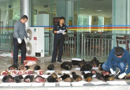 7個(gè)熊頭,其中3個(gè)已經(jīng)燙掉毛皮;大小熊掌共計(jì)11只;3個(gè)鱷魚掌;一堆鷹類尸體……地上的珍稀動(dòng)物死體幾乎壘成一座小山,而這只是本案中起獲的動(dòng)物死體的一部分。