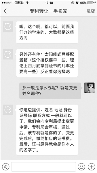 在一家機(jī)構(gòu)網(wǎng)店上,北青報(bào)記者看到,曾經(jīng)購買過“實(shí)用新型專利申請(qǐng)或轉(zhuǎn)讓”的賣家評(píng)價(jià)稱,“感覺很方便,不用自己一個(gè)人絞盡腦汁熬夜了,服務(wù)為自己省了很多力,果然人多力量大,相信最后能拿到證書。”