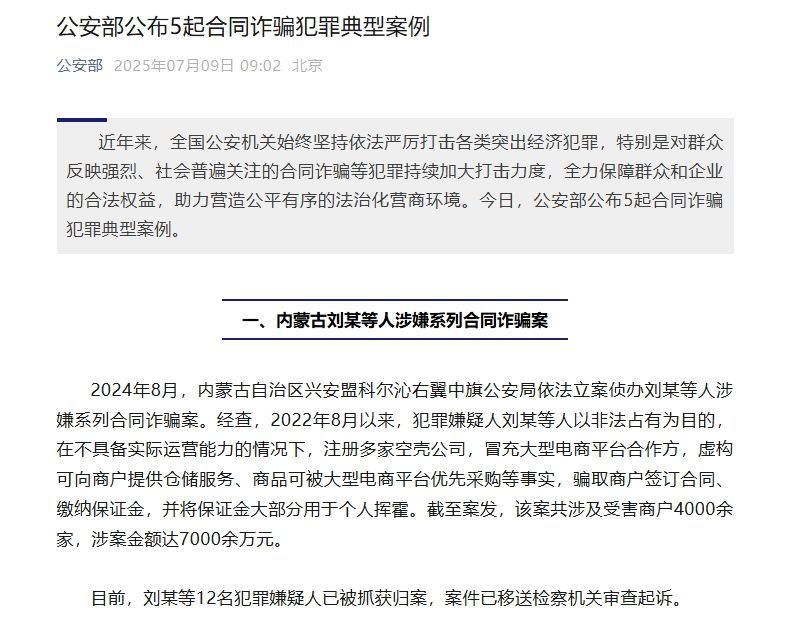 2024年8月,內蒙古自治區(qū)興安盟科爾沁右翼中旗公安局依法立案偵辦劉某等人涉嫌系列合同詐騙案。經查,2022年8月以來,犯罪嫌疑人劉某等人以非法占有為目的,在不具備實際運營能力的情況下,注冊多家空殼公司,冒充大型電商平臺合作方,虛構可向商戶提供倉儲服務、商品可被大型電商平臺優(yōu)先采購等事實,騙取商戶簽訂合同、繳納保證金,并將保證金大部分用于個人揮霍。截至案發(fā),該案共涉及受害商戶4000余家,涉案金額達7000余萬元。