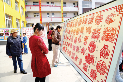 近日,靜樂縣利民小學舉辦校園書法、繪畫和剪紙作品展。據(jù)悉,此次活動共收到美術(shù)作品300 余件、書法作品300 余件、剪紙作品600 件。通過一件件作品表達了孩子們對美麗“中國夢”的憧憬。圖為學生和家長在參觀展覽。(閆曉梅 攝)