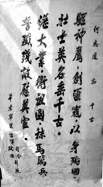 何忠道的犧牲,引起了整個空軍系統(tǒng)的震憾,人民空軍舉行了隆重的追悼大會??哲姍C關(guān)、華東軍區(qū)、生前所在部隊機關(guān)、戰(zhàn)友送了幾十幀挽幛??哲娝玖顔T劉亞樓、副司令員常乾坤、副政委吳法憲、參謀長王秉璋聯(lián)名敬獻的挽幛上書:“殲滅美國侵略者,堅決保衛(wèi)祖國領(lǐng)空,為何忠道同志復(fù)仇!”華東軍區(qū)司令部、政治部敬獻的挽幛上書:“驅(qū)神鷹,創(chuàng)飛寇,以身殉國,壯士英名垂千古。創(chuàng)大業(yè),衛(wèi)祖國,秣馬厲兵,誓殲殘敵慰英靈?!?/p>