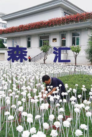 8月17日,工人師傅正在和平廣場(chǎng)安裝星際玫瑰燈組。從當(dāng)日晚開(kāi)始,5000支玫瑰燈海將炫目廣場(chǎng),為忻州創(chuàng)衛(wèi)增添新景觀。(宮清華 攝)