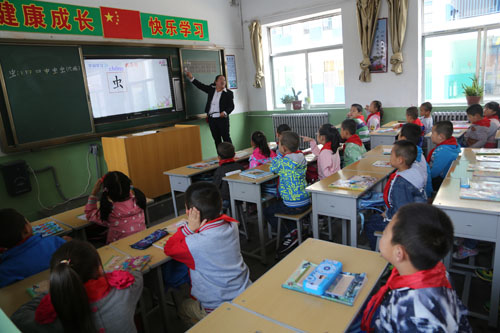 近日,在靜樂縣愛樂希望小學,學生正通過交互式多媒體教學方法上課。老師高興地說:“有了多媒體真方便,以前講一個例題要花幾分鐘抄寫在黑板上,現(xiàn)在只需幾秒鐘就顯示在頻幕上,既節(jié)省時間又提高課堂效率?!苯陙?,該縣加大教育投資力度,改善辦學條件,為學生上課提供便利。(閆曉梅 攝)