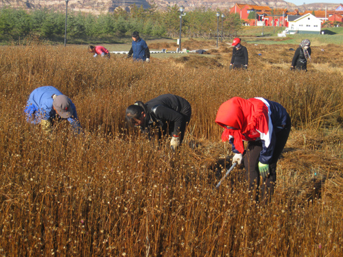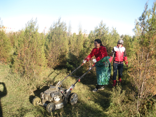 11月7日,河曲縣濱河濕地公園女工手推割草機(jī)割刈樹地的枯萎花草,顯得風(fēng)采奕奕。今年以來,數(shù)十名女工撲下身子,與漢子們一道建設(shè)450畝濕地公園,一次又一次植綠、澆水、鋤草,近日還為綠籬色帶建“防寒屋”、為樹木穿“保暖衣”、收拾花境“殘局”,成為新建公園里四季美麗的風(fēng)景線。(賈金理 攝)