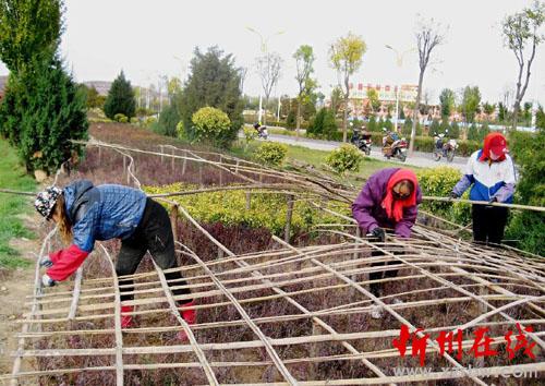 入冬以來,隨著氣溫逐漸下降,我市各地的綠籬植物紛紛住進(jìn)了“防寒屋”。圖為河曲縣濱河濕地公園正組織員工,用竹竿、竹片為綠籬植物搭建拱棚骨架,保障不耐寒的綠植順利越冬。(賈金理 攝)