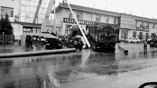 當(dāng)天夜里,五臺縣東冶鎮(zhèn)遭遇持續(xù)強(qiáng)降水天氣過程,公司調(diào)控中心值班員在凌晨3時(shí)22分發(fā)現(xiàn)10千伏829北大街線速斷掉閘,立刻電話通知所管轄區(qū)東冶供電所。得知情況后,該供電所組織搶修人員迅速趕往事故現(xiàn)場,勘查電桿及線路受損情況。經(jīng)查勘,原來是一輛重型載貨卡車在駛經(jīng)五臺縣東冶鎮(zhèn)時(shí),因連夜大雨導(dǎo)致路面濕滑把一基電桿給撞倒了,斷裂的電桿壓在大卡車上,大卡車無法行駛。這一意外事件,造成了10千伏北大街線失電、沿線居民用電中斷。10千伏829北大街線是東冶鎮(zhèn)街道主要干線,生產(chǎn)任務(wù)繁重,能否盡快恢復(fù)送電直接關(guān)乎沿線居民的切身利益。