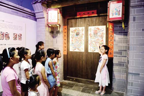 7月30日,小講解員在武強年畫博物館介紹年畫門神。
