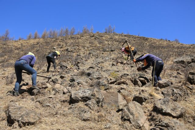 塞罕壩機械林場工人在石質(zhì)陽坡上造林(2016年4月13日攝)。新華社發(fā)
