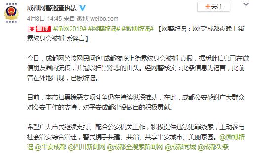 4月8日,成都網警對此辟謠稱:接網民問詢“成都夜晚上街露紋身會被抓”真假,據悉此信息已在微信朋友圈內流傳,并冠以掃黑除惡的由頭。經網警核實,此條信息為謠言,此前曾在外地出現(xiàn),已被辟謠。目前,本市掃黑除惡專項斗爭仍在持續(xù)縱深推動,在此,成都公安感謝廣大群眾對公安工作的支持,對平安成都建設做出的積極貢獻。希望廣大市民繼續(xù)支持、配合公安機關工作,積極提供違法犯罪線索,主動參與社會治安綜合治理,警民攜手共建、共治、共享平安城市、美麗家園。