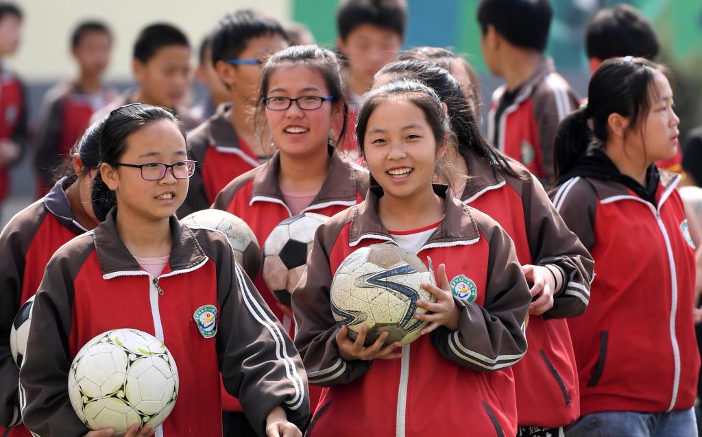↑這是學(xué)生們準(zhǔn)備做足球操(4月18日攝)。新華社記者李俊東攝