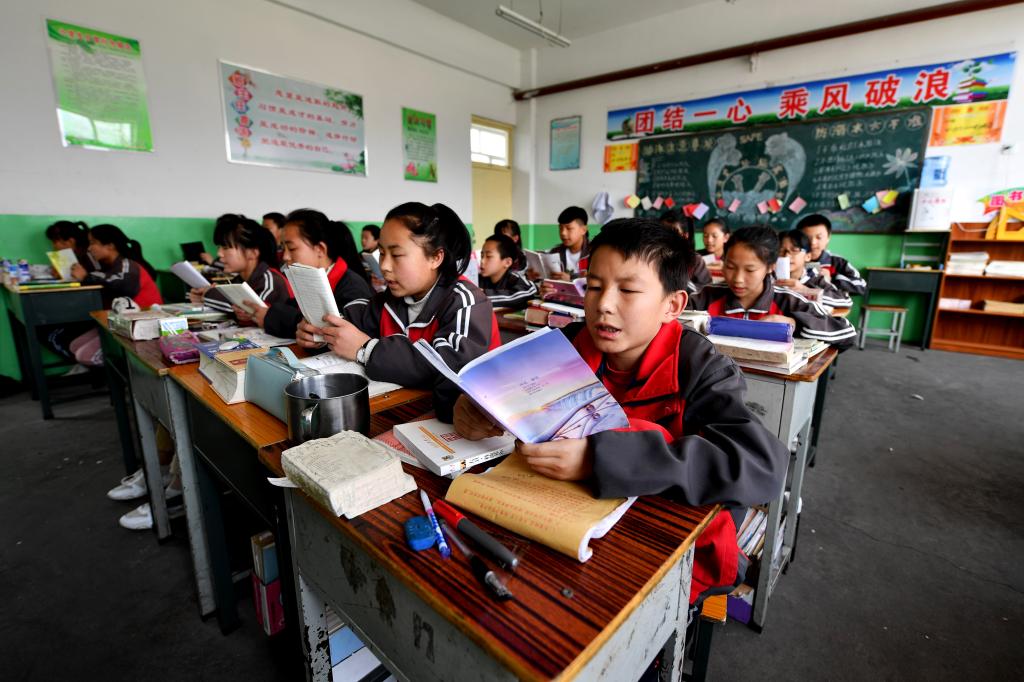 ↑這是初一121班的學(xué)生們?cè)谡n堂上朗讀課文(4月18日攝)。新華社記者詹彥攝