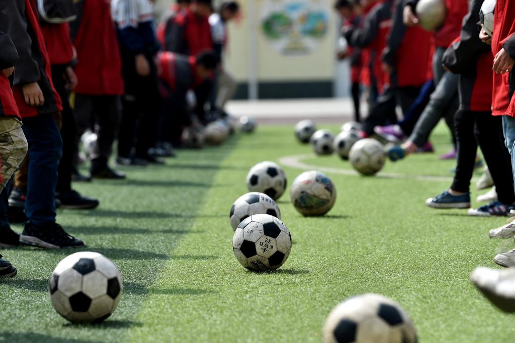 ↑這是學(xué)生們?cè)诰毩?xí)傳球(4月18日攝)。新華社記者詹彥攝