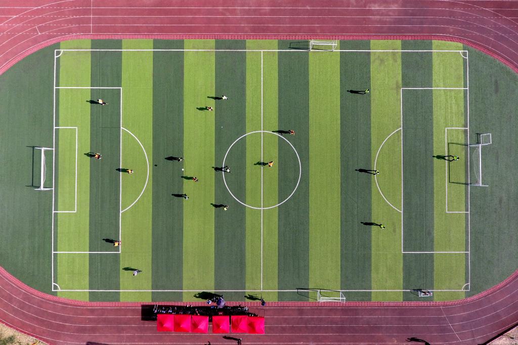 ↑這是初中組男子足球隊(duì)隊(duì)員們?cè)谶M(jìn)行分組對(duì)抗賽(4月17日無(wú)人機(jī)拍攝)。新華社記者詹彥攝