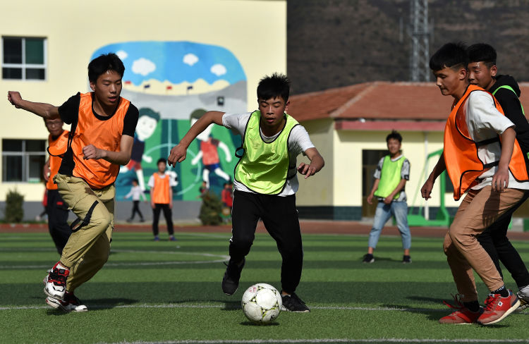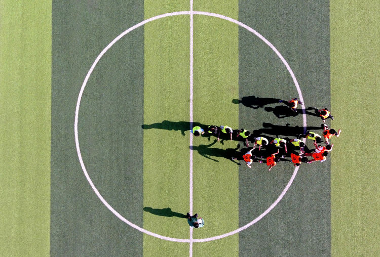 ↑這是初中組男子足球隊(duì)隊(duì)員在分組對抗賽開始前互相擊掌(4月17日無人機(jī)拍攝)。新華社記者詹彥攝