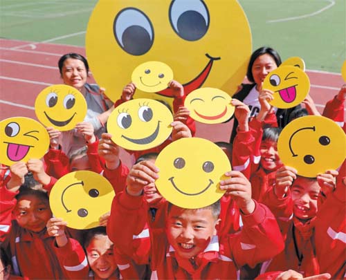 5月7日,各地學(xué)校舉辦豐富多彩的“微笑”主題活動(dòng),迎接5月8日世界微笑日的到來(lái)。圖為河北省秦皇島市河?xùn)|小學(xué)的學(xué)生在展示笑臉卡。