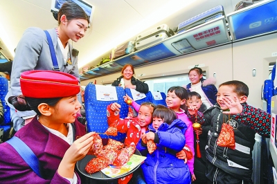 1月24日,在重慶開往福州的G1755次列車上,乘務(wù)員和“小候鳥”做游戲。春運期間,大批務(wù)工人員子女隨長輩踏上與父母團聚的旅途,南鐵福州客運段提前對重點線路乘務(wù)組進行兒童陪護培訓(xùn),在列車上準備了書本和玩具,用愛心護航“小候鳥”的團圓路。新華社記者 宋為偉攝