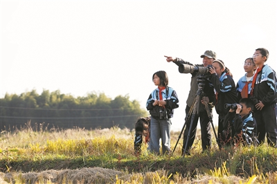 圖為在位于安徽省池州市的十八索省級自然保護區(qū),茅坦小學的學生在野生鳥類保護志愿者的帶領下用相機記錄鳥類。