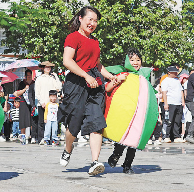福建泉州安溪縣第十四幼兒園,家長(zhǎng)與孩子參加親子體育活動(dòng)。豐曉飛攝(人民視覺(jué))