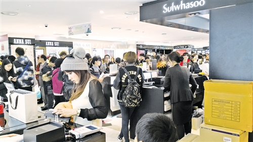 “雪花秀”品牌作為愛茉莉太平洋旗下的高檔化妝品品牌在中國游客中頗具人氣。圖為樂天免稅店首爾小公洞店“雪花秀”專柜,等待購物的顧客排起了20米長隊,其中絕大多數(shù)都是中國游客。本報駐首爾記者 楊 明攝