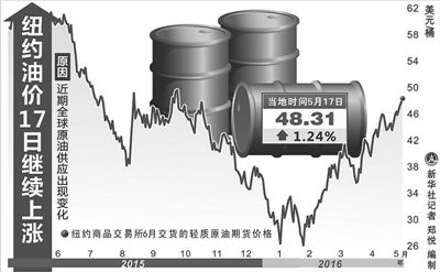 近期,國(guó)際原油價(jià)格屢現(xiàn)攀升,逼近每桶50美元。5月17日,截至當(dāng)日收盤,紐約商品交易所6月交貨的輕質(zhì)原油期貨價(jià)格上漲0.59美元,收于每桶48.31美元,漲幅為1.24%。7月交貨的倫敦布倫特原油期貨價(jià)格上漲0.31美元,收于每桶49.28美元,漲幅為0.63%。分析認(rèn)為,一些突發(fā)因素導(dǎo)致了近期油價(jià)攀升,國(guó)際油市實(shí)現(xiàn)供需平衡仍需時(shí)日。