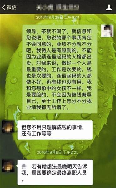 微信中還顯示,關(guān)某某在微信中多次以談“業(yè)績”為由,約女員工“出來見面聊聊”。對(duì)于如此扭曲的上下級(jí)關(guān)系,有評(píng)論稱,本是靠能力吃飯的行當(dāng),最后將“業(yè)績籌碼”演繹成“陪睡游戲”。除了反胃和憤怒,更多的是對(duì)這個(gè)時(shí)代的拷問。
