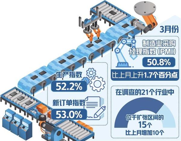 國(guó)家統(tǒng)計(jì)局服務(wù)業(yè)調(diào)查中心高級(jí)統(tǒng)計(jì)師趙慶河表示,3月份,隨著企業(yè)加快復(fù)工復(fù)產(chǎn),市場(chǎng)活躍度提升,制造業(yè)PMI升至50.8%,重返擴(kuò)張區(qū)間。在調(diào)查的21個(gè)行業(yè)中有15個(gè)位于擴(kuò)張區(qū)間,比上月增加10個(gè),制造業(yè)景氣面明顯擴(kuò)大。