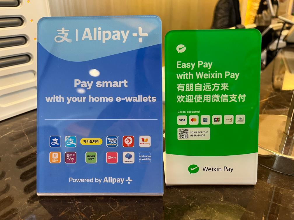 北京香格里拉飯店內(nèi)擺放的支付寶、微信支持使用境外電子錢包和境外銀行卡標(biāo)識。新華社記者張千千 攝