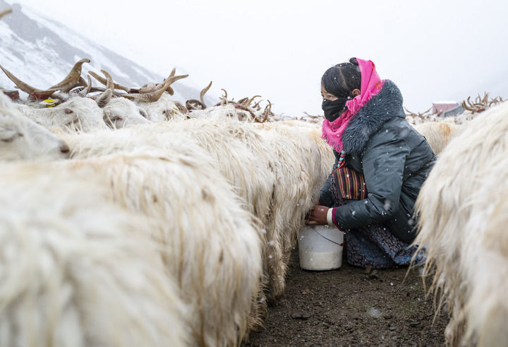 在西藏阿里地區(qū)日土縣龍門卡村白絨山羊擴(kuò)繁場(chǎng),飼養(yǎng)員在給白絨山羊擠奶(2024年9月13日攝)。新華社記者 孫瑞博 攝