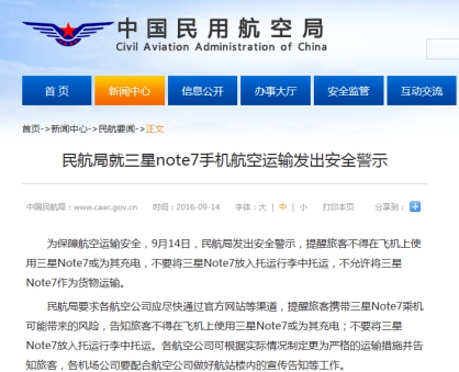 受三星“炸機門”事件持續(xù)發(fā)酵的影響,為了保障乘客出行安全,中國各大航空公司對三星Note7紛紛下達了“封殺令”! 9月13日,中國首家航空公司-海南航空宣布禁止集團員工攜帶Note7登機、托運,并且也不接受旅客在飛機上使用和托運Note7。隨后,中國民航局要求各航空公司應(yīng)盡快通過官方網(wǎng)站等渠道,提醒旅客攜帶Note7乘機可能帶來的風險。截至9月15日,中國國內(nèi)已有14家航空公司針對Note7出臺禁令。