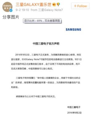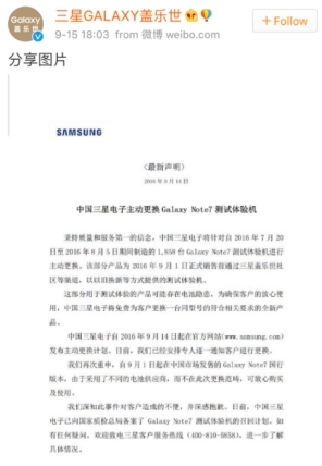 迫于壓力,三星方面關(guān)于Note7在中國的政策也發(fā)生了變化。9月14日,三星在國家質(zhì)檢總局備案,宣布召回2016年7月20日至2016年8月5日期間制造的1858臺Note7手機。