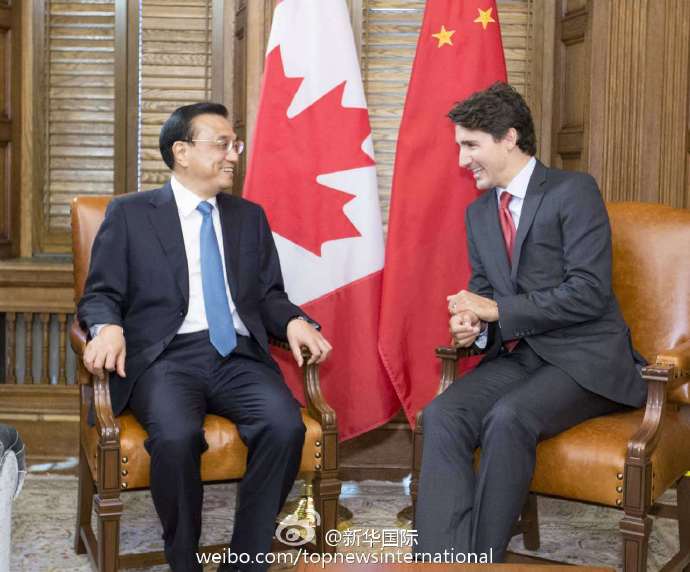 新華網(wǎng)北京9月23日電 當(dāng)?shù)貢r(shí)間22日,李克強(qiáng)總理與加拿大總理特魯多舉行會(huì)談,確認(rèn)正式啟動(dòng)中加總理年度對(duì)話(huà)機(jī)制。會(huì)談中,兩國(guó)總理就中加關(guān)系和共同關(guān)心的地區(qū)國(guó)際問(wèn)題進(jìn)行了廣泛深入的交談。這是李克強(qiáng)和特魯多在不到一個(gè)月時(shí)間里第二次會(huì)晤。特魯多本月初剛剛訪(fǎng)華。(據(jù)新華社“新華國(guó)際”微博報(bào)道)
