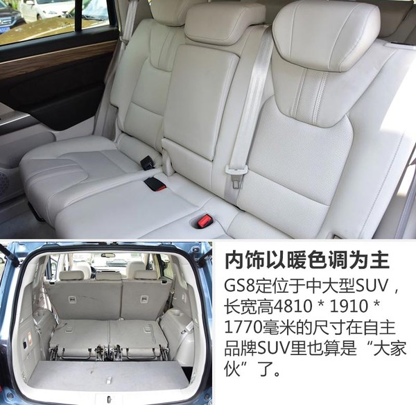 GS8的設(shè)計由原奔馳設(shè)計師張帆操刀,在內(nèi)飾部分也較為洞察國內(nèi)消費者的喜好。車內(nèi)整體寬敞舒適,顏色采用偏暖的木色,打造一種家用溫馨感。空間方面,GS8的長寬高分別為4810*1910*1770毫米,軸距2800毫米,采用7座布局。