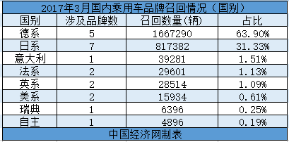 從國別情況來看,3月,德系共5個品牌召回車輛1667290輛,占召回總量的63.9%;日系共7個品牌召回汽車817382輛,占比31.33%;法系、英系和美系各有2個品牌發(fā)布召回召回公布,分別召回汽車29601輛、28514輛、15934輛,占比分別為1.13%、1.09%、0.61%;其余,意大利、瑞典以及自主各有一個品牌發(fā)布召回公告,合計占召回總量的1.95%。