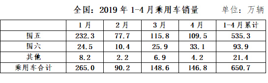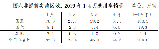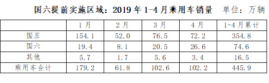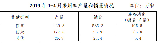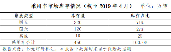 中汽協(xié)發(fā)布的數(shù)據(jù)顯示, 截至2019年4月份,我國乘用車庫銷比達(dá)3.1,遠(yuǎn)高于行業(yè)1.5的警戒線;行業(yè)整體庫存約450萬輛,國五車輛庫存320萬輛左右(占行業(yè)庫存的71%),其中國六提前實(shí)施區(qū)域的國五車輛庫存175-220萬輛(調(diào)研企業(yè)推算得出)。