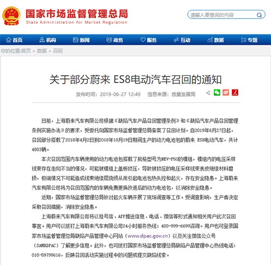 而上半年召回市場中,最令人關(guān)注的則非“壓軸登場”的蔚來ES8召回事件莫屬。6月27日,蔚來公告稱將召回4803輛搭載了2018年4月2日到2018年10月19日期間生產(chǎn)的動力電池包的蔚來ES8電動汽車,這也是對其“兩個月內(nèi)3輛ES8起火”風波的“回應”。