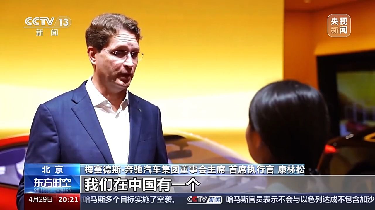 梅賽德斯-奔馳汽車(chē)集團(tuán)董事會(huì)主席、首席執(zhí)行官 康林松:我們?cè)谥袊?guó)有一個(gè)非常全面的電動(dòng)化戰(zhàn)略。在中國(guó),研發(fā)對(duì)我們來(lái)說(shuō)變得越來(lái)越重要。(央視新聞客戶(hù)端)