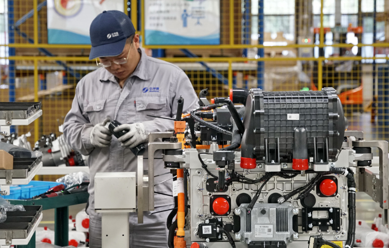 圖為在北京大興國際氫能示范區(qū)內,一家生產氫能燃料電池發(fā)動機企業(yè)的員工在裝配設備。新華社記者 李欣 攝