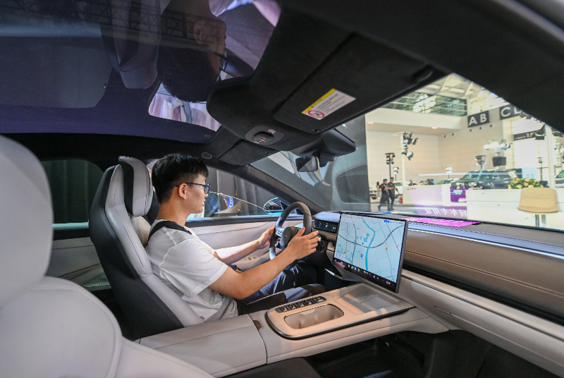 觀眾在2024世界智能產(chǎn)業(yè)博覽會(huì)現(xiàn)場(chǎng)靜態(tài)體驗(yàn)一款智能網(wǎng)聯(lián)電動(dòng)汽車(chē)(6月22日攝)。新華社記者 孫凡越 攝