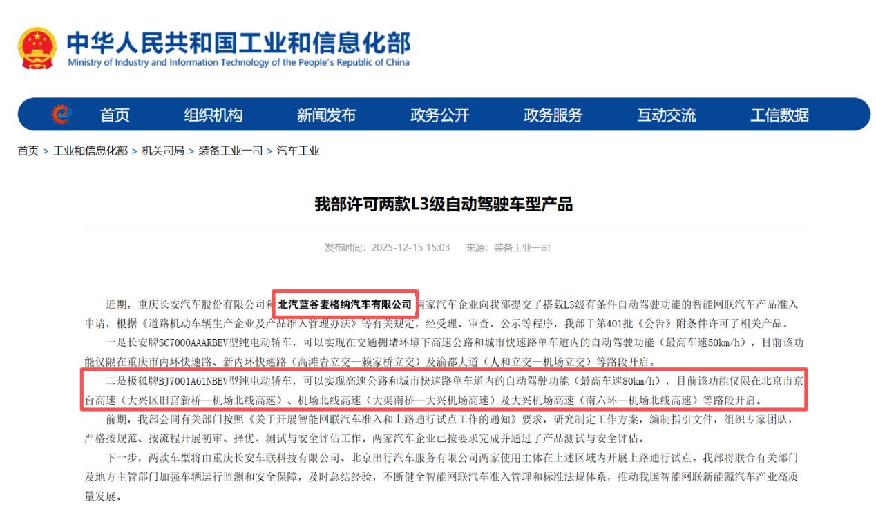 12月15日,北汽集團(tuán)旗下極狐阿爾法S(L3版)正式獲批工業(yè)和信息化部自動駕駛車型產(chǎn)品準(zhǔn)入許可,即將在北京市限定區(qū)域內(nèi)開展L3級有條件自動駕駛上路通行試點(diǎn)。這標(biāo)志著我國自動駕駛技術(shù)發(fā)展逐步走向量產(chǎn)應(yīng)用階段,也是北汽集團(tuán)在自動駕駛領(lǐng)域從技術(shù)驗(yàn)證階段邁向量產(chǎn)應(yīng)用階段的重要里程碑。