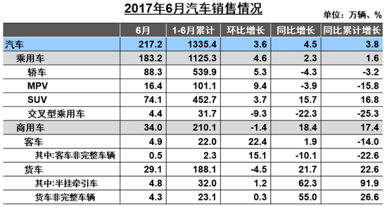 6月,我國汽車產(chǎn)銷分別為216.7萬輛和217.2萬輛,環(huán)比分別增長(zhǎng)3.9%和3.6%,同比分別增長(zhǎng)5.4%和4.5%。上半年,我國汽車產(chǎn)銷分別為1352.6萬輛和1335.4萬輛,比上年同期分別增長(zhǎng)4.6%和3.8%,低于上年同期1.9和4.3個(gè)百分點(diǎn)。