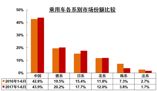 上半年,德系、日系、美系、韓系和法系乘用車分別銷售227.52萬輛、198.92萬輛、135.17萬輛、43.09萬輛和18.84萬輛,分別占乘用車銷售總量的20.22%、17.68%、12.01%、3.83%和1.67%。與上年同期相比,日系乘用車銷量保持較快增長(zhǎng),德系和美系增速略低,韓系和法系降幅依然明顯。陳士華表示,韓系車銷量下滑多少是受了政治因素的影響,然而最主要的原因還是產(chǎn)品競(jìng)爭(zhēng)力低,新產(chǎn)品投放速度慢以及產(chǎn)品質(zhì)量差等問題。
